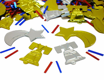 Red, White, & Blue Galaxy Mix, Z8914 - Red, White, & Blue Galaxy Confetti. White is Plastic. Blue and Red are Metallic. 1/8", 1/4", & 3/4". Available in Pounds or 1/2 oz. Packets